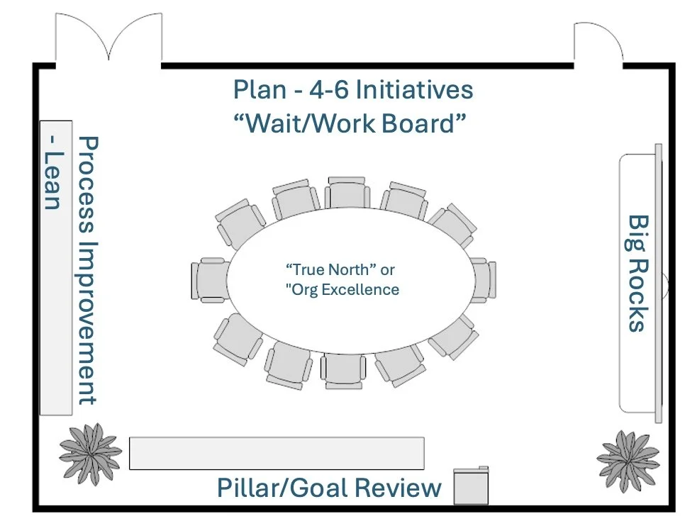 The room is laid out in a way that allows the organization’s leadership team to walk through each key element of the strategy and operational focus, ensuring every strategic initiative, goal, and improvement project gets attention. This review happens 1-2 times per month, ensuring that we stay focused on the right things at the right time. Let's take a closer look at each wall in the review process: